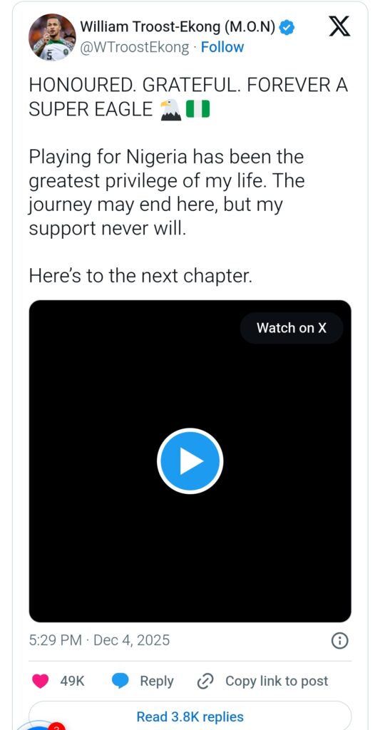 Nigeria’s captain, William Troost-Ekong, has retired from international football, days after he was included in the Super Eagles’ provisional squad for the 2025 Africa Cup of Nations (AFCON) billed to start on December 21.
